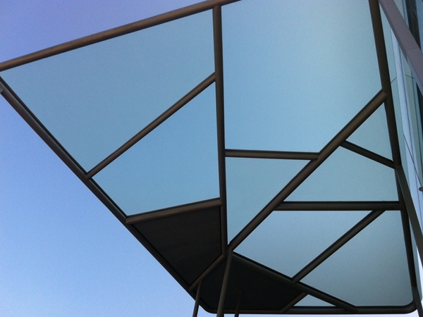 Full-size prototype of glazed tubular canopy for access to cinemas.